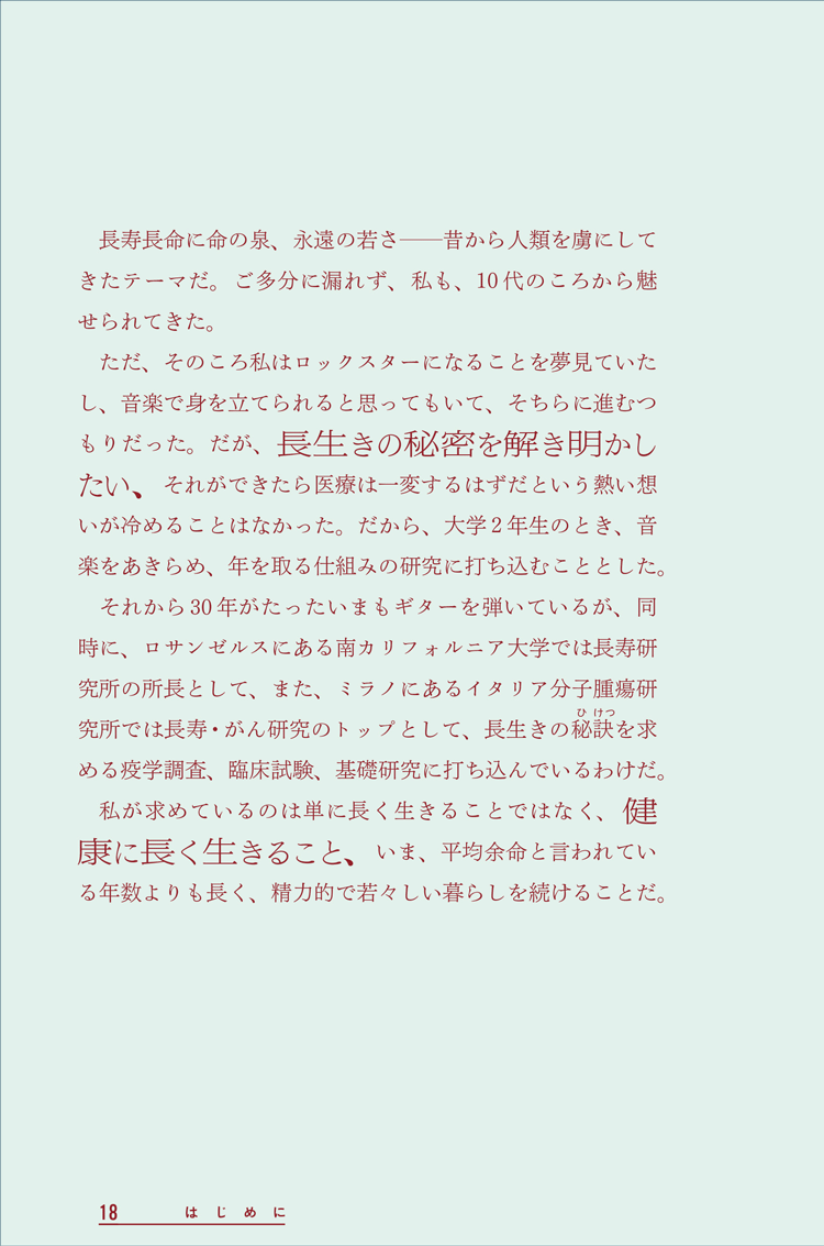 ロサンゼルスの南カリフォルニア大学(USC)長寿研究所所長。長寿および加齢関連疾患の国際的権威。米欧の複数拠点で、栄養・遺伝・老化を横断する研究を推進。単純生物やマウスを用いて老化の根本機構を探究。2010年NIA/NIHネイサン・ショック・レクチャー賞、2013年AFARヴィンセント・クリストファロ〈ライジング・スター〉賞、2016年グレン医学研究財団グレン研究賞を受賞。2018年『TIME』誌「医療分野で最も影響力のある50 人」に選出。2021~2025年